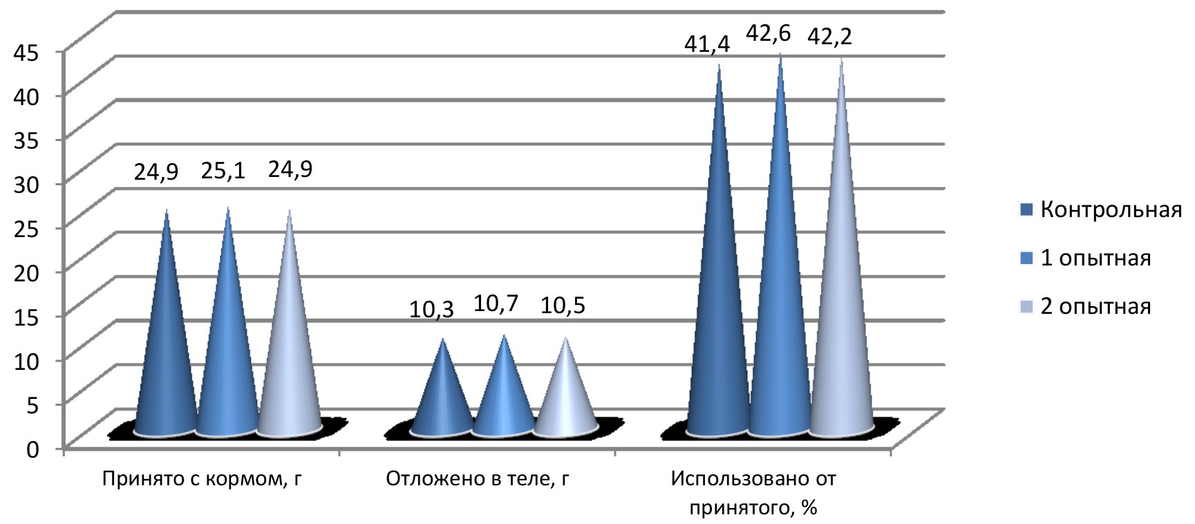 Исследование по определению баланса азота у животных сопровождается данными изучения его усвоения от принятого с кормом. Так, величина использования азота от принятого с рационом у молодняка в группе контроля - 24,0 % уступала 1 группе опыта - на 2,0 (Р<0,01) и 2 группе - на 2,3 % (Р<0,01).