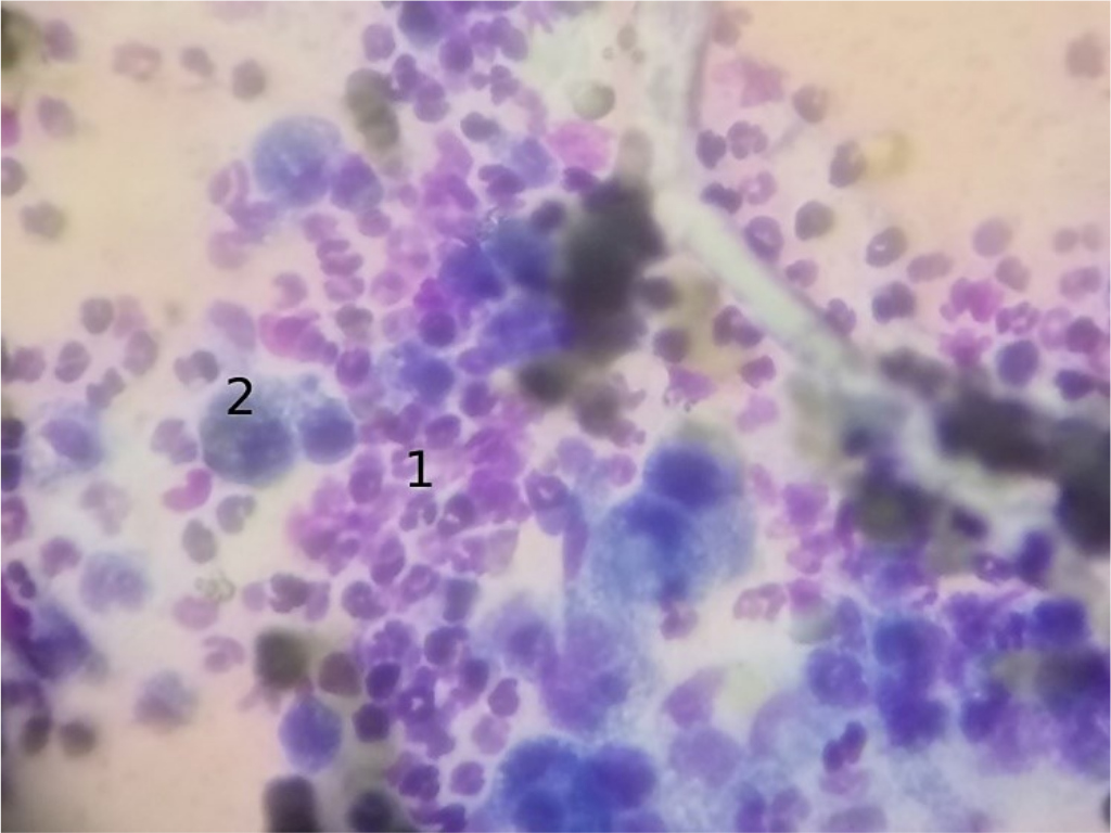 Рис. 5. ТИАБ новообразования, лабрадор, возраст 7 лет окраска Азур-эозин по Романовскому, увеличение х400: 1 - веретенообразные мезенхимальные клетки; 2 -эритроциты