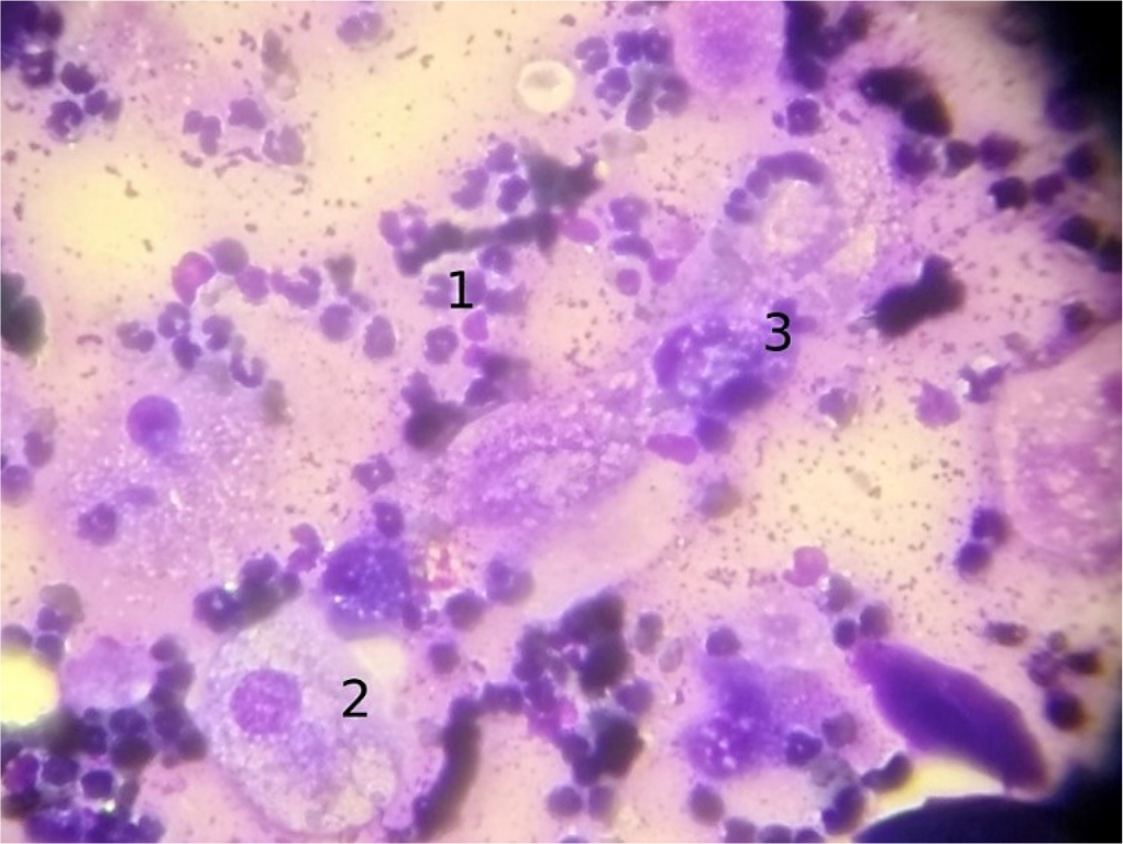 Рис. 2. ТИАБ новобразования основания ушной раковины, лабрадор, возраст 7 лет, окраска Азур-эозин по Романовскому, увеличение х400: 1 – дегенеративные сегментоядерные нейтрофилы; 2 – макрофаги; 3 – фагоцитоз лейкоцитов
