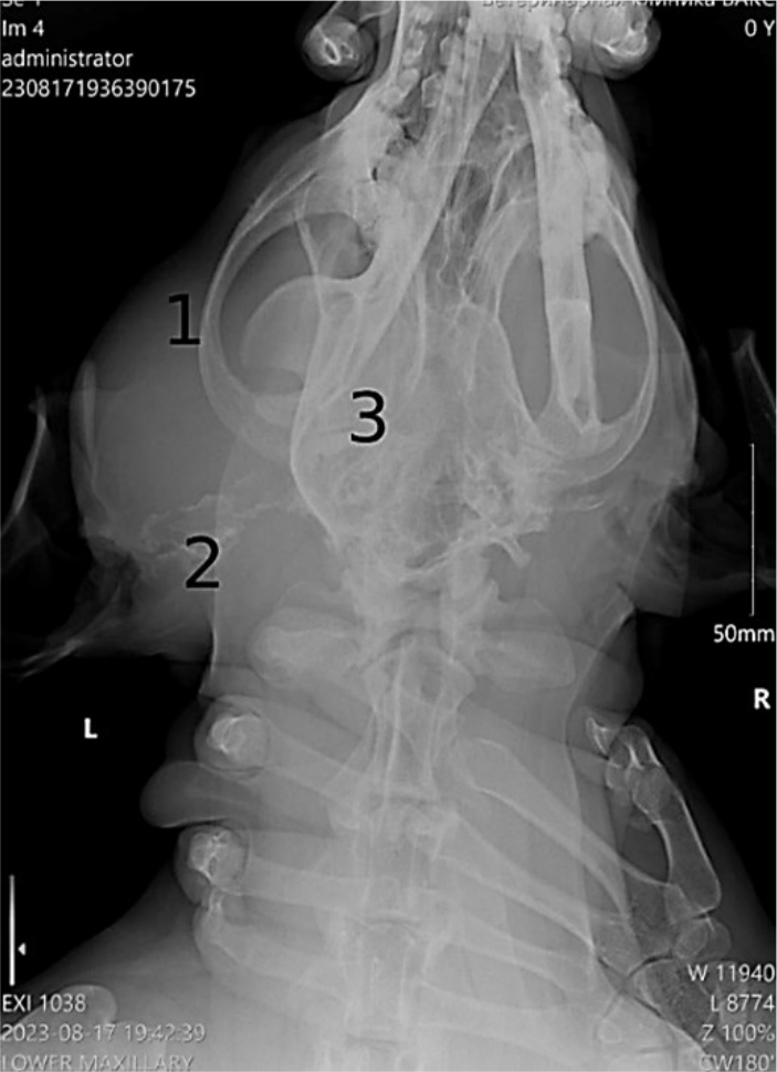 Рис. 3. Рентгенограмма, лабрадор, возраст 7 лет: 1 – мягкотканое новообразование; 2 – минерализация слухового прохода; 3 – повышение рентгенплотности левого барабанного пузыря