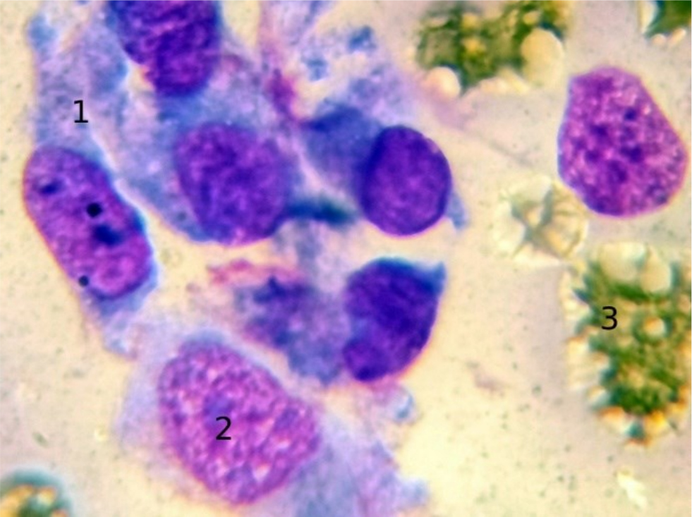 Рис. 4. ТИАБ новообразования, лабрадор, возраст 7 лет окраска Азур-эозин по Романовскому, увеличение х400: 1 – веретенообразные мезенхимальные клетки; 2 – ядро с нуклеолами в количестве 4 штуки; 3 – разрушенные эритроциты