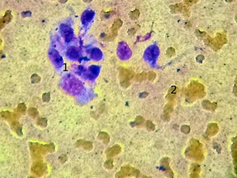 Рис. 1. Мазок отпечаток содержимого наружного слухового прохода, лабрадор, возраст 7 лет, окраска Азур-эозин по Романовскому, увеличение х400: 1 – дегенеративные сегментоядерные нейтрофилы; 2 – макрофаги