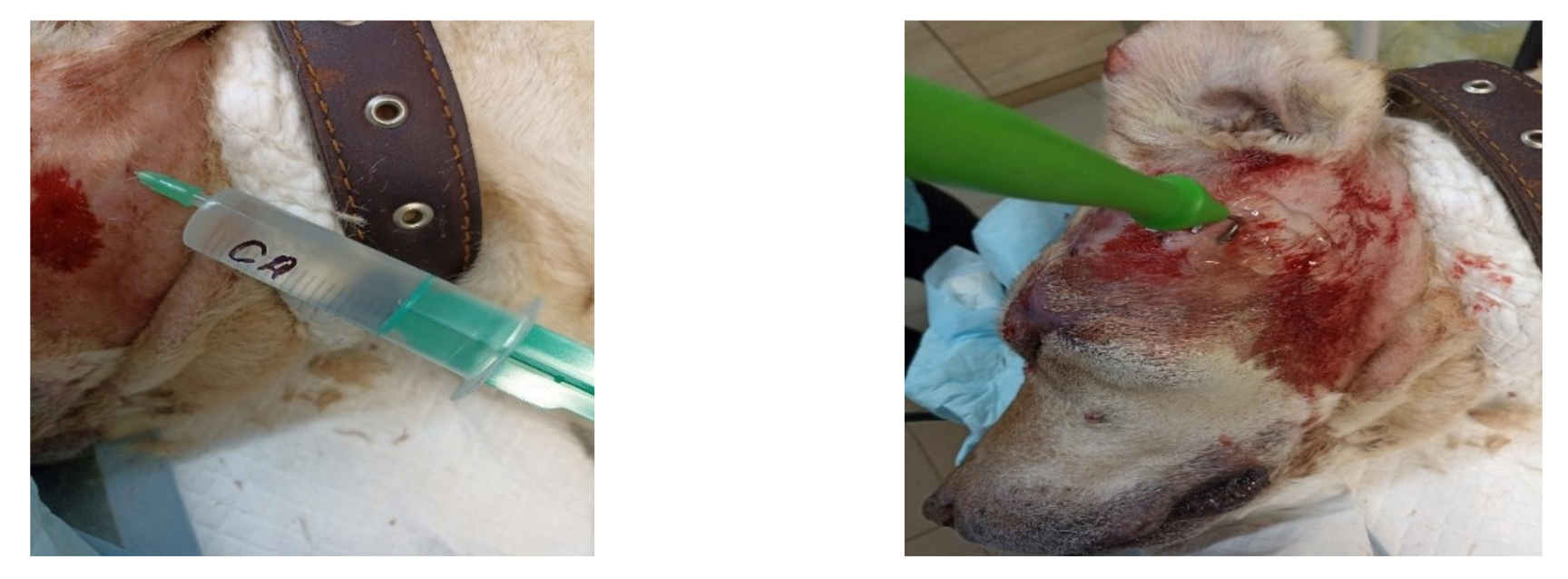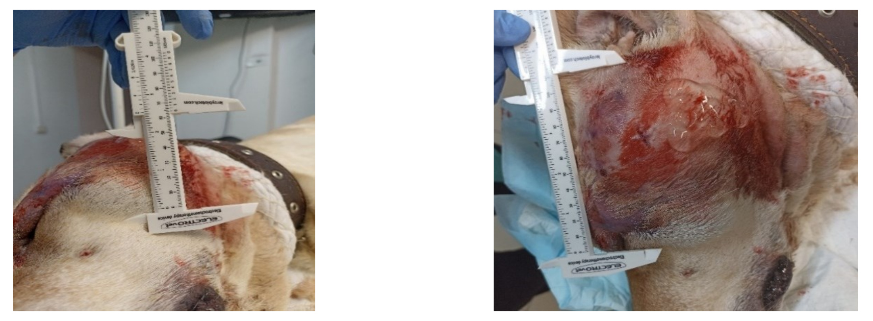 Рис. 7. Гемангиосаркома мягких тканей у собаки породы лабрадор возраст 7 лет: слева – введение глюконата кальция в основание опухоли; справа – проведение электропорации L-образным электродом