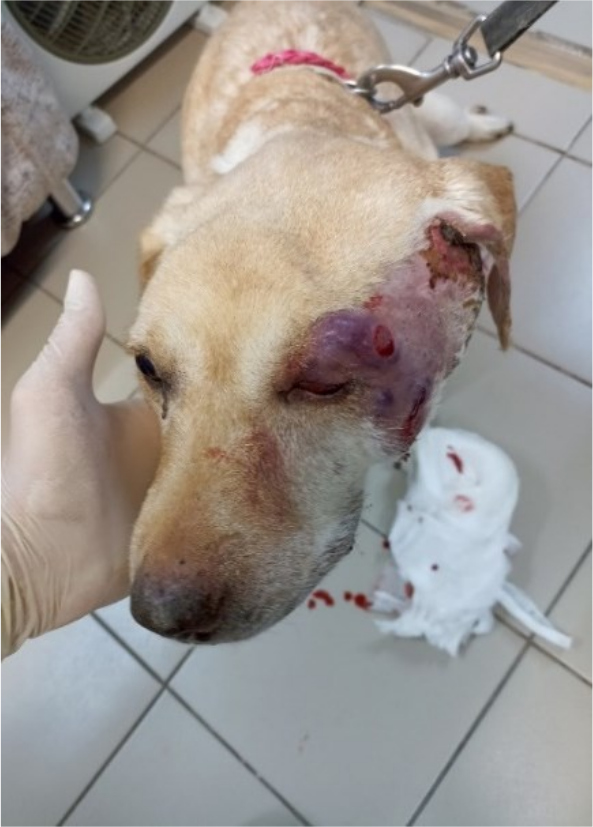 После проведение процедуры через 48 часов отмечается обильная экссудация и выделение гнойных масс, рану промыли большим количеством антисептика (фурацилина) и местно применили мазь левомеколь. При пальпации отмечается болезненность, в связи с этим для контроля боли и воспаления пациенту назначен мелоксикам 0,2 мг/кг и амоксиклав 20 мг/кг. Через 7 дней после процедуры наблюдали положительную динамику – отек уменьшился, кровотечение остановилось, поведение удовлетворительное (Рис. 8).