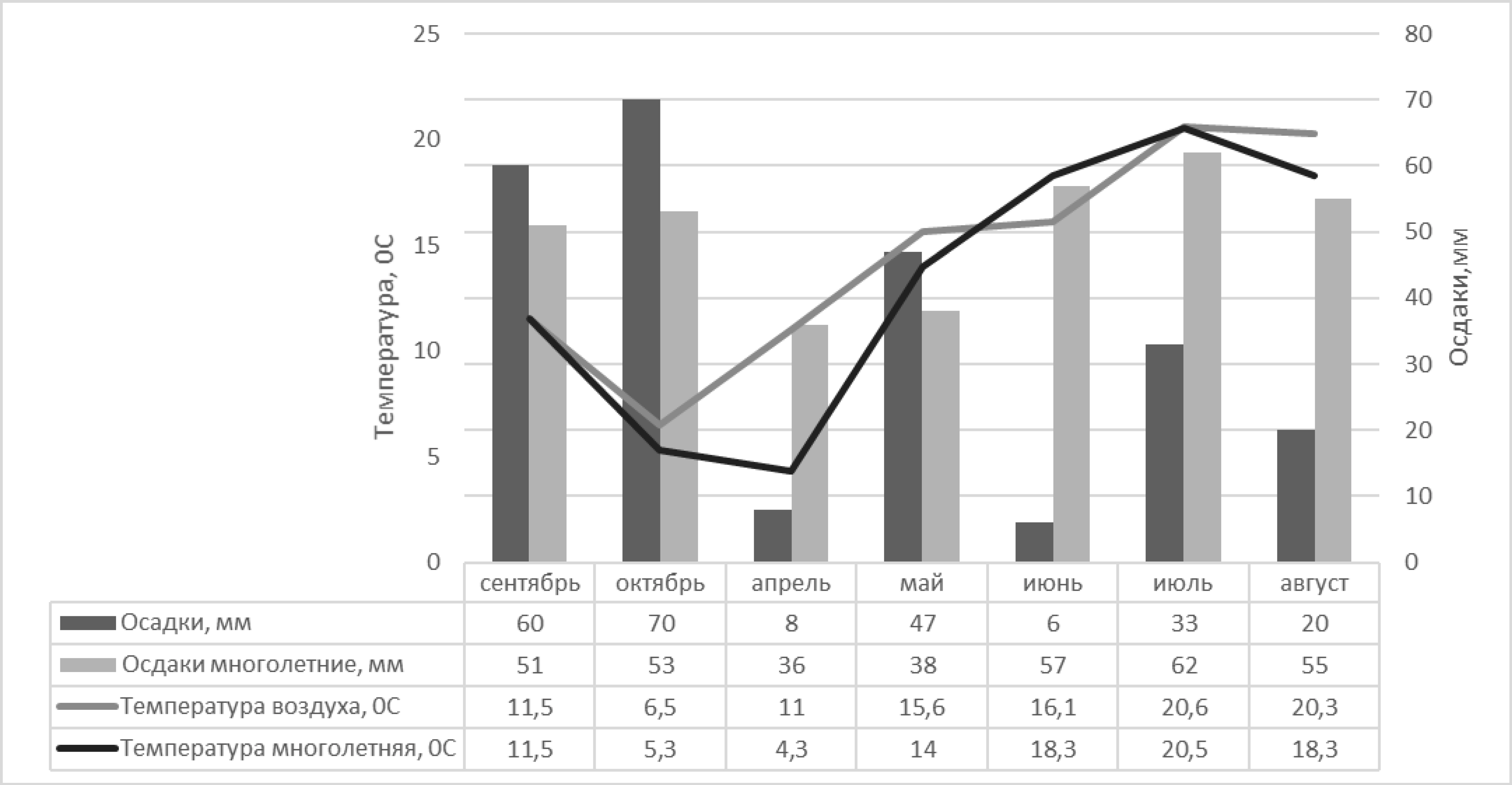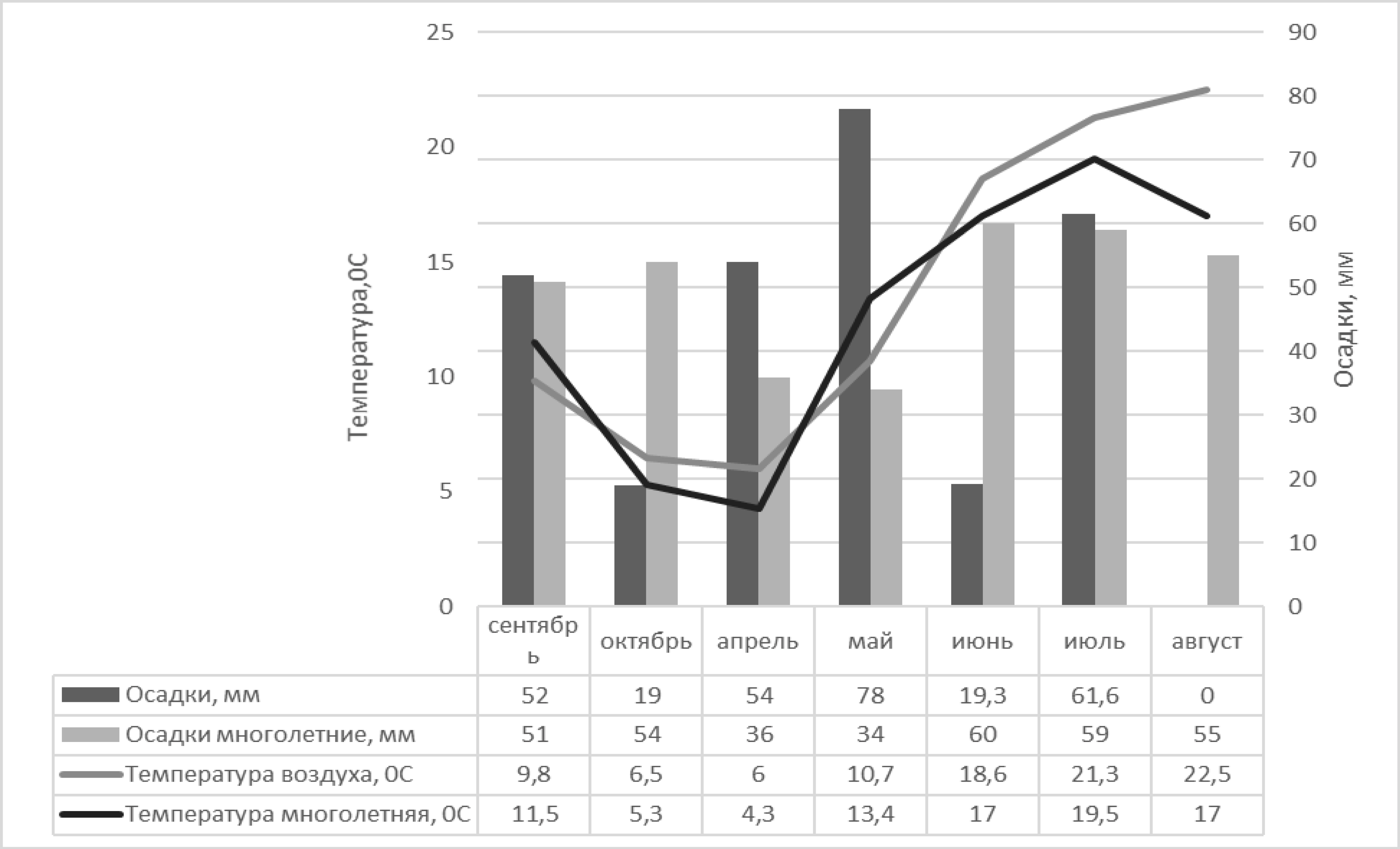 Метеорологические условия в период вегетации озимой пшеницы 2021-2022 годы были благоприятными для роста и развития озимой пшеницы (рис. 1). Условия 2023 года из-за незначительных осадков во второй и третьей декадах июня негативно отразились на продуктивности озимой пшеницы (рис. 2).
