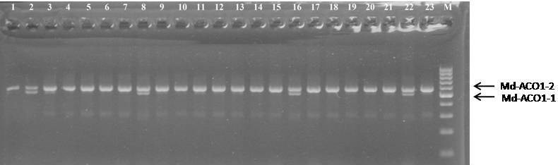 Ген Md-ACO1 оказывает менее сильное влияние на биосинтез этилена в плодах при созревании яблок и действует независимо от гена Md-ACS1. Аллельные различия гена Md-ACO1 обусловлены наличием в генотипе InDel (Insertion/Deletion) сайта в третьем интроне с размером инсерции в 62 пары нуклеотидов. Мутация аллеля 1 (InDel в третьем интроне) гена Md-ACO1 (Md-ACO1-1) связана со снижением выработки этилена [12]. Гомозиготные по аллелю Md-ACO1-1 сорта яблони синтезируют меньшее количество этилена, чем гетерозиготные и гомозиготные по аллелю Md-ACO1-2.