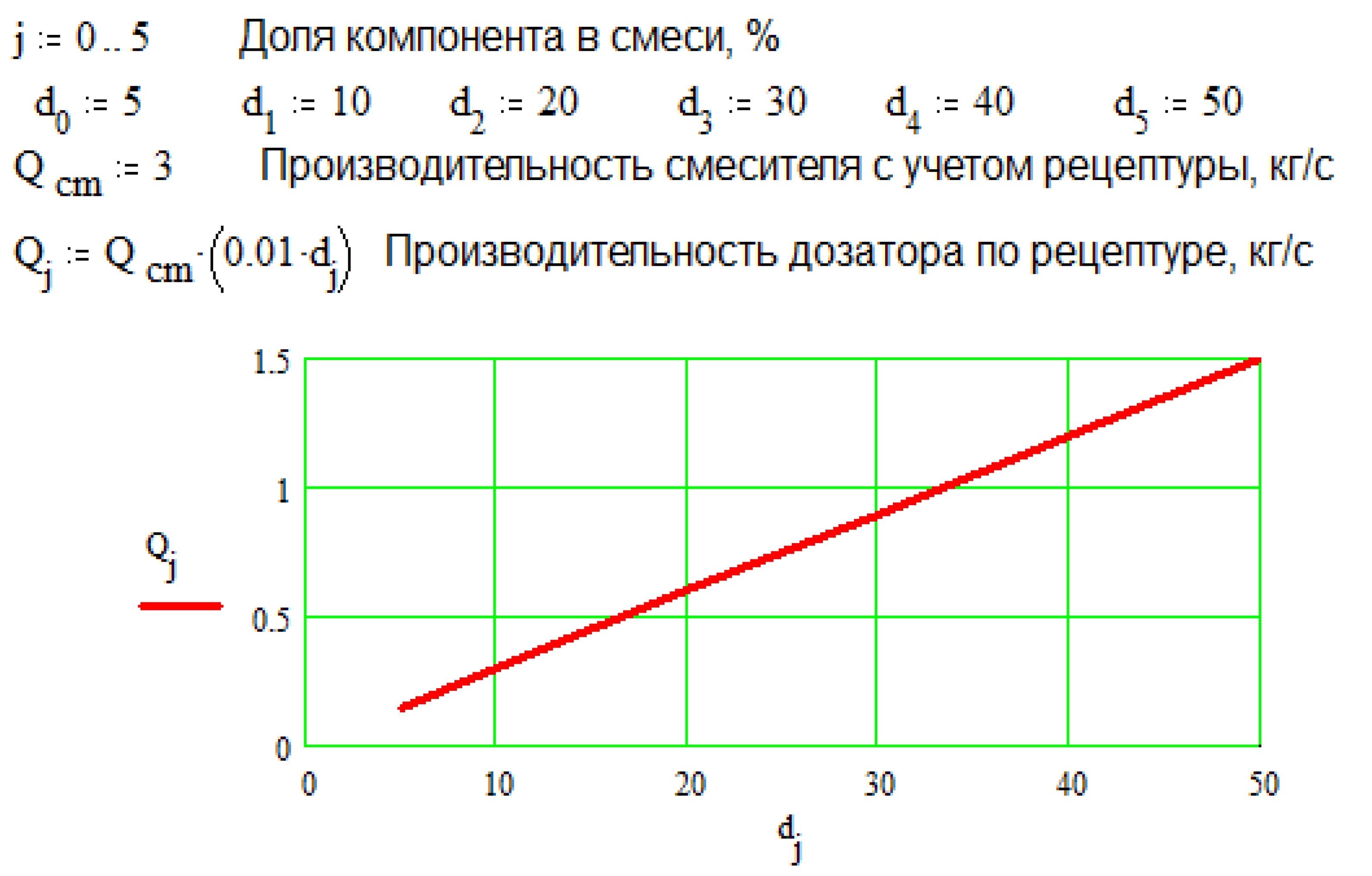 Рис. 1. Листинг текстовой части программы в математическом пакете MatchCAD по определению влияния доли контролируемого компонента dj (%) на заданную производительность его дозатора Qj (кг/с)
