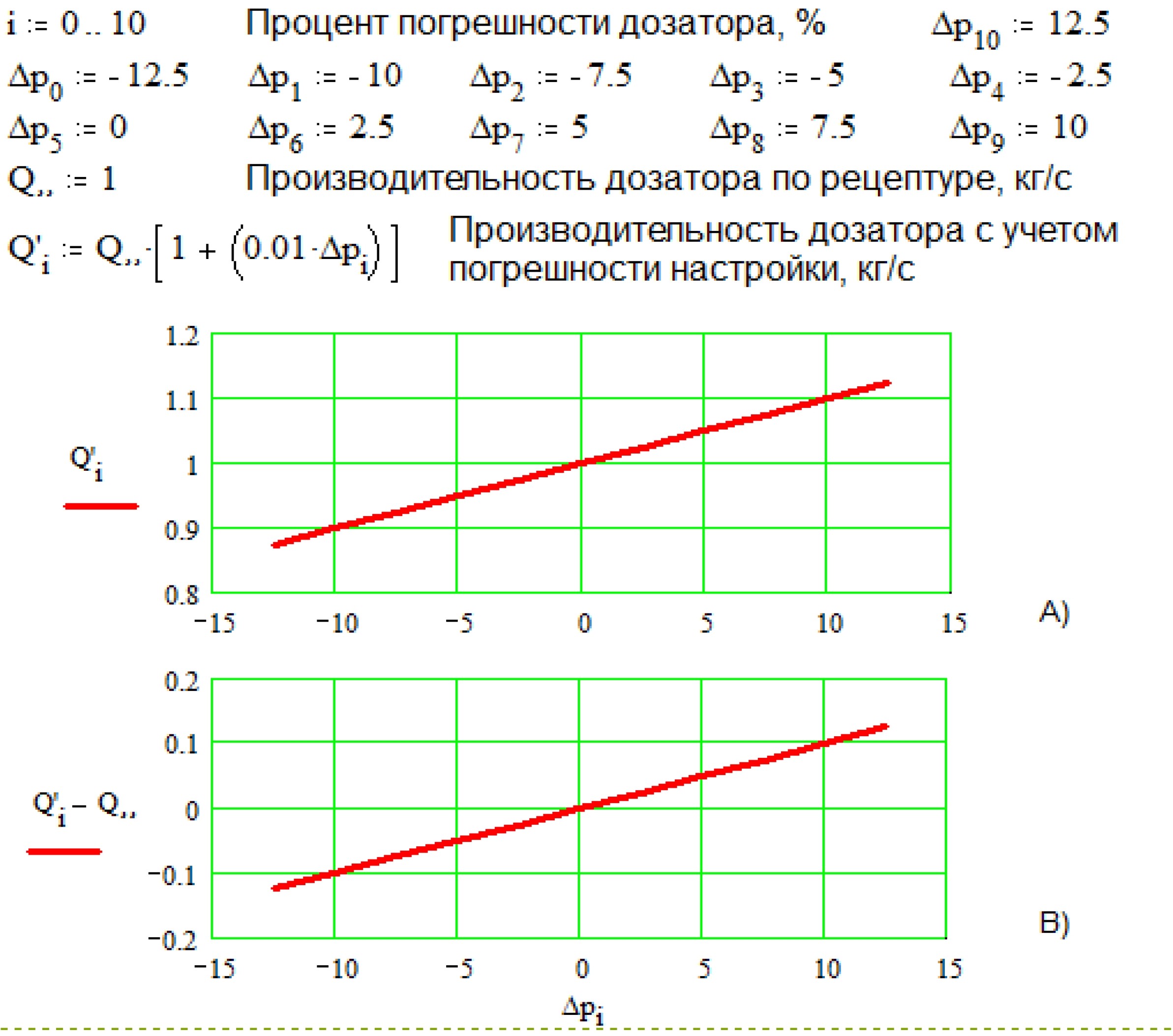Рис. 2. Листинг текстовой части программы в математическом пакете MatchCAD по определению влияния погрешности настройки конкретного дозатора Δpi (%) на: А) заданную производительность его дозатора Qi, кг/с; В) фактическое отклонение значений производительности дозатора (Qi-Q), кг/с