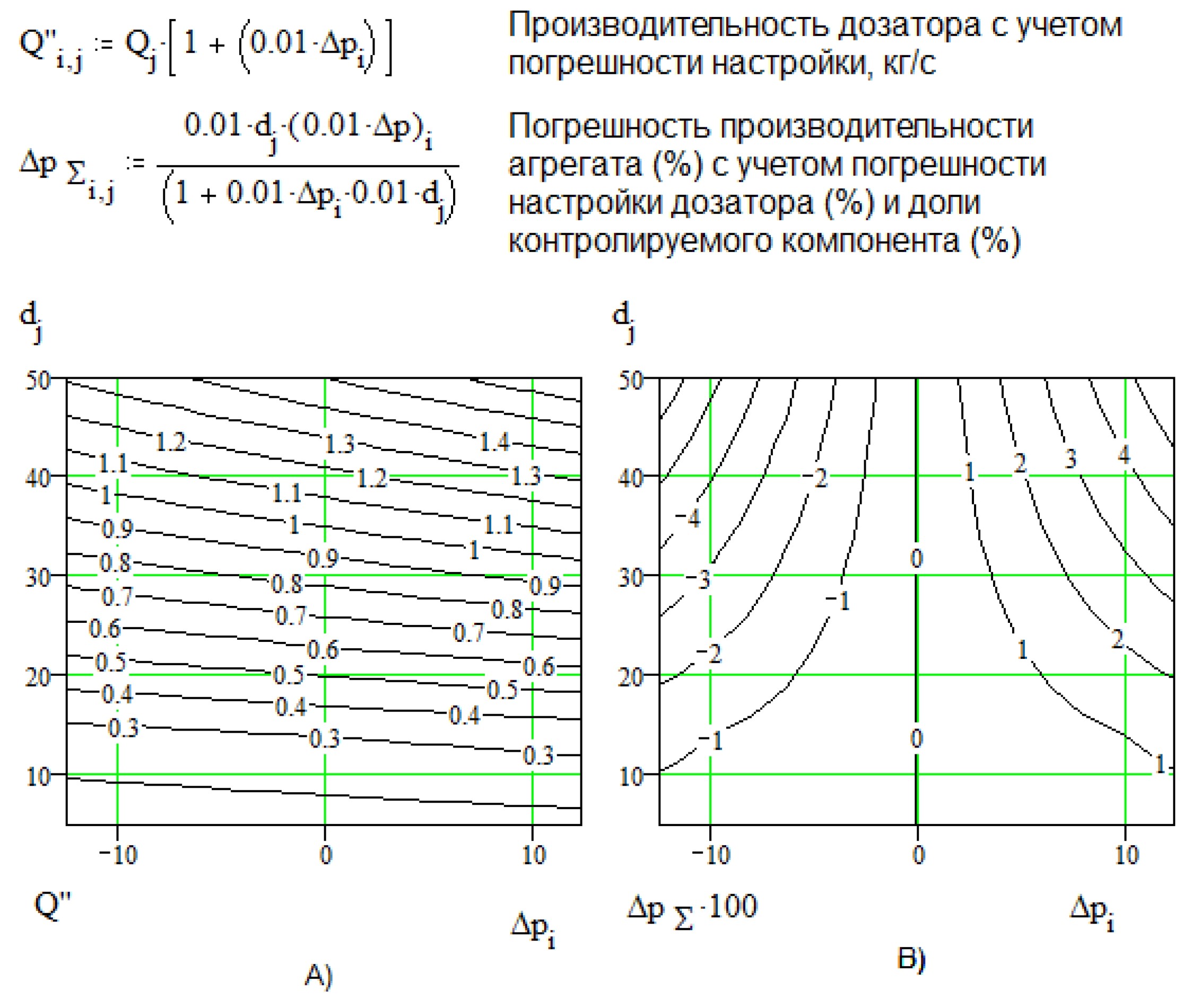 Рис. 3. Листинг текстовой части программы в математическом пакете MatchCAD по определению влияния погрешности настройки конкретного дозатора Δpi(%) и доли контролируемого компонента смеси dj(%) на: А) производительность дозатора Qi с учетом погрешности его настройки, кг/с; В) погрешность производительности смесительного агрегата Δp∑(%)