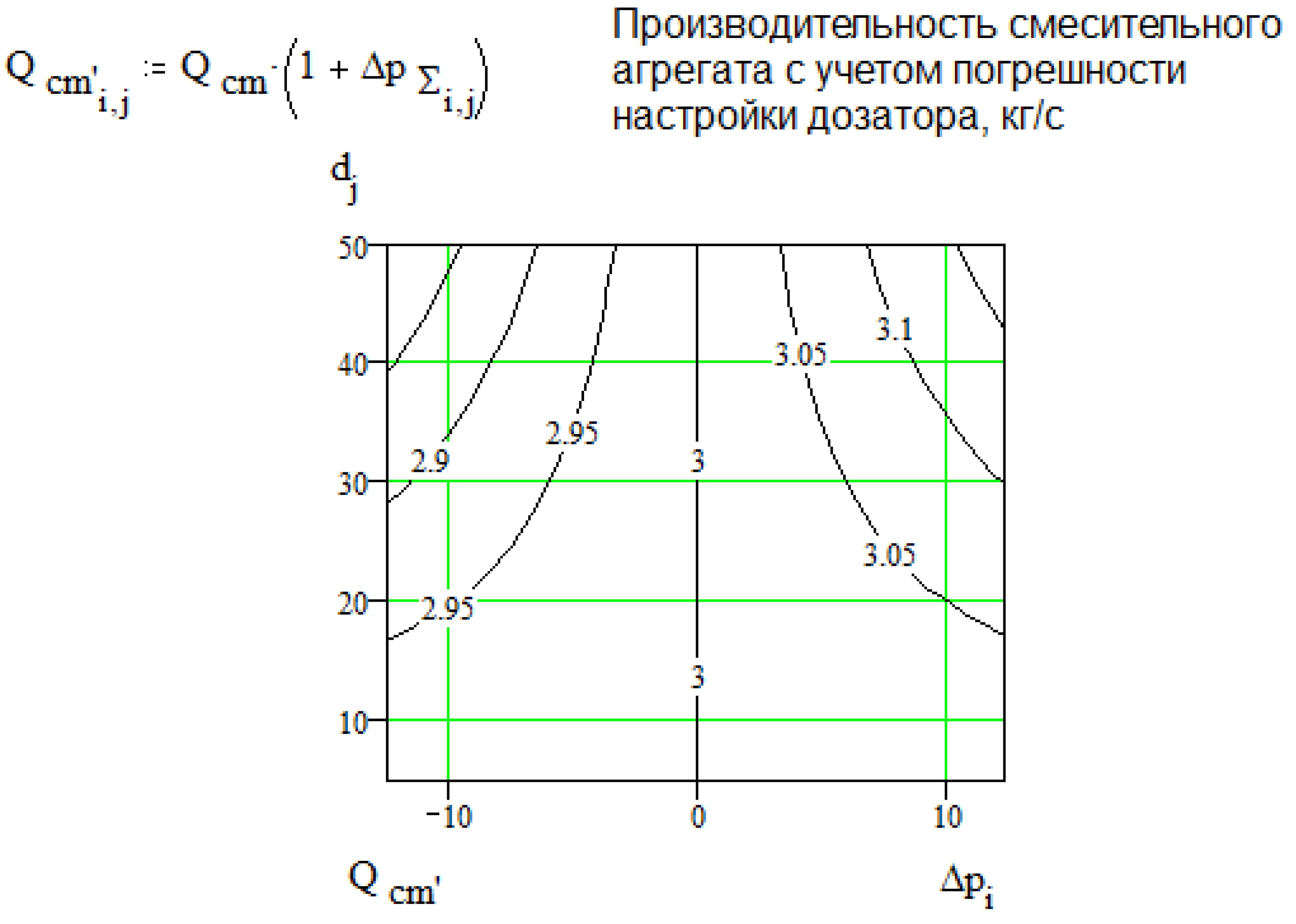 Для удобства анализа и интерполяции результатов приняли расчетную производительность смесительного агрегата 3 кг/с в интервале рабочей производительности предложенного смесительного агрегата 6-12 т/ч [28]. При установлении влияния погрешности настройки дозатора использовали его производительность 1 кг/с.