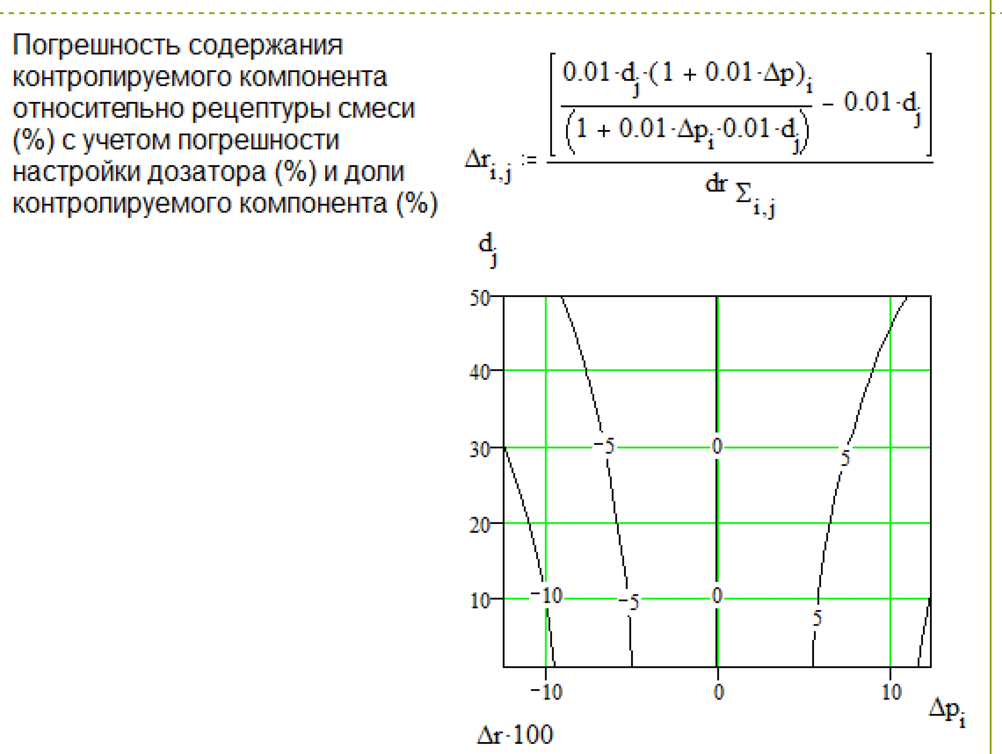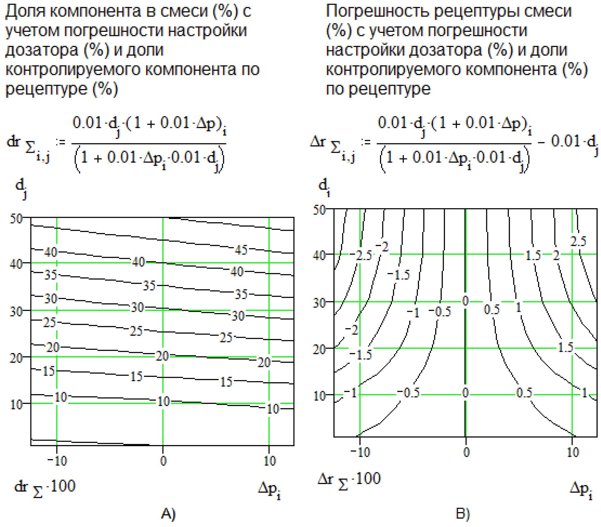 - - доли компонента в рецепте смеси при конкретных значениях относительной погрешности настройки конкретного дозатора на относительную и абсолютную погрешность рецептуры смеси.