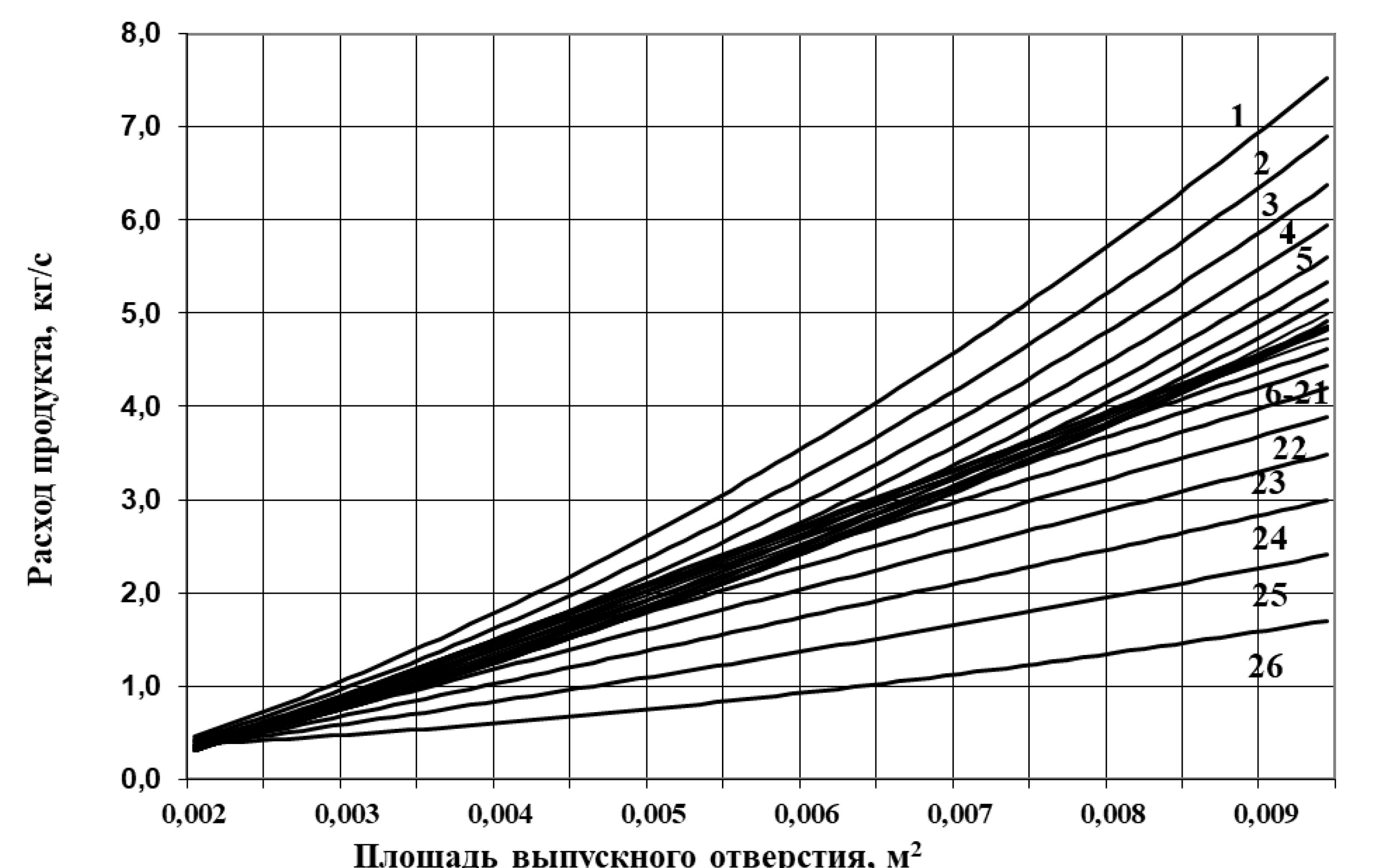 Рис. 2.Экспериментальные данные зависимости скорости истечения пшеницы (расхода продукта) от площади пропускания (выпускного отверстия) при начальном наполнении бункера 0,04 м³ и порциях 1-26