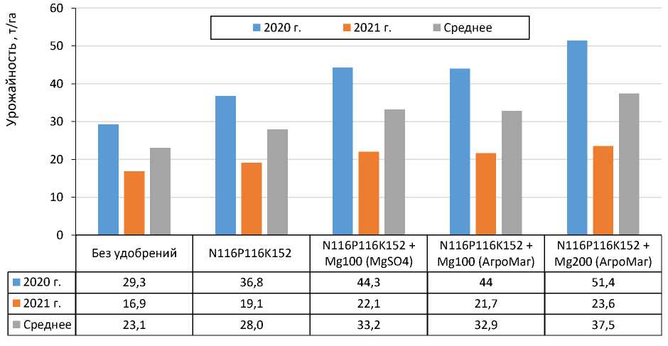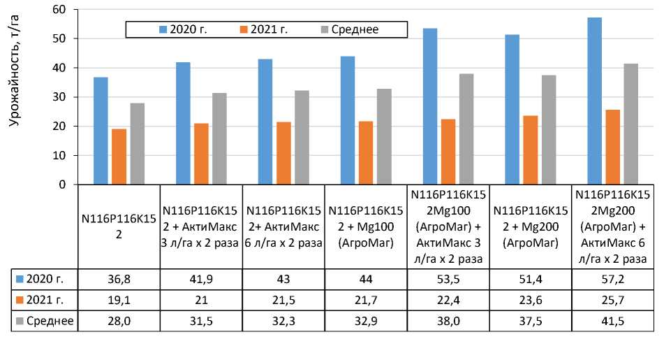 Некорневые опрыскивания дважды за сезон жидким агрохимикатом «АгроМаг АктиМакс» (3 л/га) на магнийсодержащем фоне N116P116K152Mg100 в 2020 г. обеспечили прибавку 9,5 т или 21,6%, тогда как в засушливом 2021 г. влияние было недостоверно; от той же дозы «АгроМаг АктиМакс» (3 л/га) на NPK-фоне (N116P116K152) получены достоверные прибавки урожайности в оба года исследований: 2020 г. – 5,1 т (13,9%) и в 2021 г – 1,9 т (9,9%) (рис. 2).