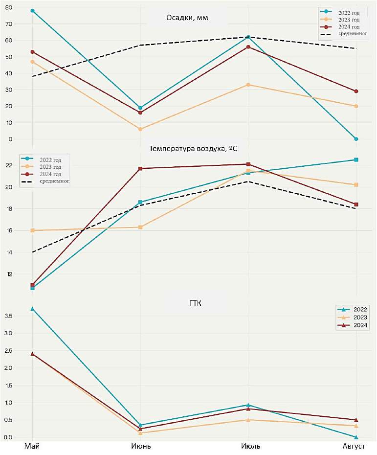 Условия погоды в период вегетации ярового ячменя за 2022–2024 годы демонстрировали значительные отклонения от многолетних норм, что оказало прямое влияние на формирование урожая выращиваемой культуры (рис. 1). Анализ осадков выявил выраженную нестабильность их распределения. В 2022 году майские осадки (78 мм) значительно превысили многолетний уровень (38 мм), создавая переувлажнение, тогда как июнь (19 мм против 57 мм) и август (0 мм против 55 мм) оказались экстремально засушливыми. В 2023 году дефицит осадков усилился: в июне выпало лишь 6 мм при норме 57 мм, а июль и август также остались ниже средних значений. В 2024 году ситуация немного улучшилась, но июнь (16 мм) и август (29 мм) сохранили засушливый характер, что критично для фазы налива зерна. Сочетание высоких температур с дефицитом осадков усиливает испарение, создавая гидротермический дисбаланс. Гидротермический коэффициент (ГТК) отражает эту динамику: в засушливые месяцы (июнь 2022 - 0,35; июнь 2023 - 0,12) значения ГТК опускались до критически низких уровней, указывая на острый дефицит влаги. Даже в относительно благополучные периоды, такие как июль 2022 года (ГТК 0,93), коэффициент оставался близким к нижней границе оптимального диапазона.