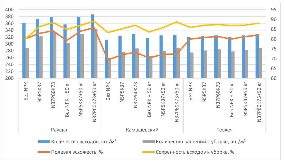 Применение различных доз удобрений (N5P5K37 и N37P60K73) положительно коррелирует с повышением полевой всхожести, количества продуктивных стеблей и сохранности растений (рис. 2). Например, у сорта Раушан использование N37P60K73 + 50 кг влагосорбента увеличило количество всходов до 386 шт./м² (против 361 шт./м² без удобрений), а сохранность растений достигла 89,1%, что на 9% выше контрольного варианта. Аналогичная тенденция наблюдается у Камашевского: максимальная сохранность (88,7%) зафиксирована при комбинированном применении удобрений и влагосорбента.