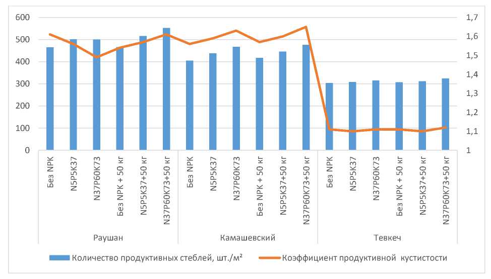 Наибольший прирост продуктивности отмечен у Камашевского: при использовании N37P60K73 + 50 кг влагосорбента, количество продуктивных стеблей достигло 477 шт./м², что на 72 шт./м² выше, чем на контроле. Это подчеркивает потенциал интенсивных технологий для данного сорта. В то же время у Тевеча даже при максимальной дозе удобрений и влагосорбента (N37P60K73 + 50 кг) продуктивность стеблей составила 325 шт./м², что значительно ниже, чем у других сортов, что подтверждает его специфику как менее кустистого, но стабильного варианта.