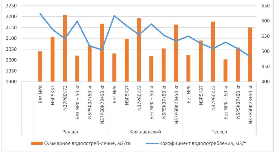 Однако коэффициент водопотребления (м³/т), отражающий эффективность использования воды на единицу продукции, снижается при применении удобрений. У того же Раушана коэффициент уменьшается с 624 до 505 м³/т при переходе от контрольного варианта к N37P60K73+50 кг. Такая динамика наблюдается у всех сортов, что указывает на повышение эффективности использования воды при использовании удобрений и влагосорбента: растения создают больше биомассы на единицу водных ресурсов. Даже добавление влагосорбента без NPK (например, «Без NPК + 50 кг/га») снижает коэффициент, демонстрируя роль влагоудержания в оптимизации водопользования.