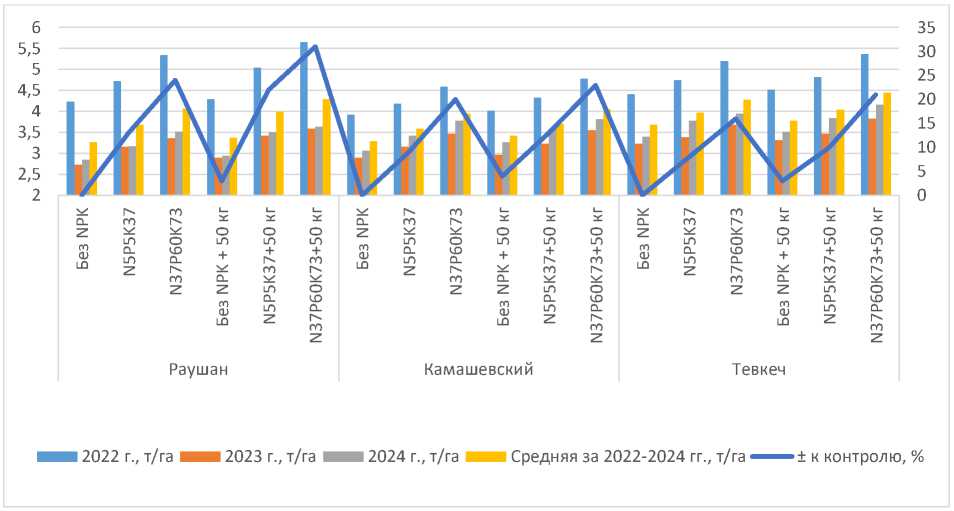 Динамика по годам выявила снижение урожайности в 2023 году для всех вариантов, что связано с неблагоприятными погодными условиями. Например, у Раушана показатель упал с 4,23 т/га в 2022 до 2,73 т/га в 2023, но восстановился до 2,85 т/га в 2024. При этом варианты с удобрениями демонстрировали меньшую амплитуду колебаний, что подчеркивает их роль в стабилизации урожаев. Наименьшая существенная разница (НСР) для всех сортов составила 0,22–0,46 т/га, что подтверждает достоверность наблюдаемых различий.