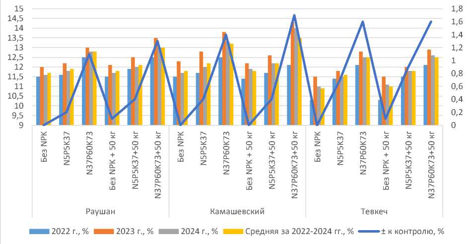 В 2023 году зафиксирован пик содержания белка для большинства комбинаций. Например, у Камашевского при N37P60K73 + 50 кг показатель достиг 14,3%, что на 2,1% выше, чем в 2022 г. (12,1%).