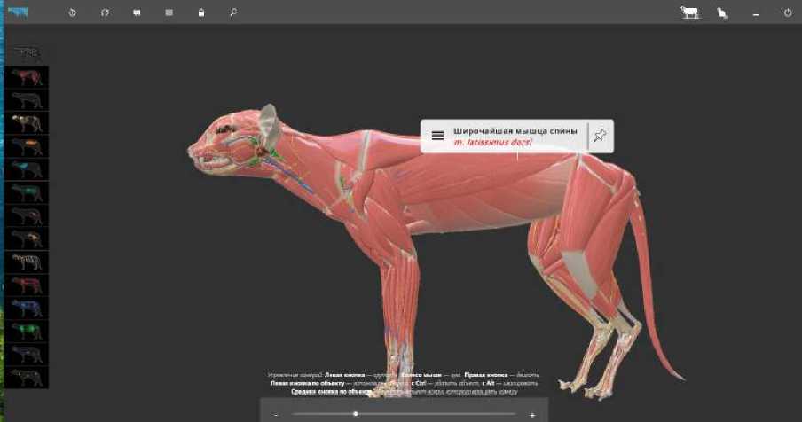 Заключение. Межвузовское сотрудничество способствовало междисциплинарному контакту, позволившему разработать цифровой анатомический 3D-атлас – изображение органов и систем представителя мелких домашних животных – кошки, что обеспечит освоение анатомии кошки с помощью использования цифровой технологии. 3D-атлас кошки окажет помощь студентам аграрных вузов по специальности «Ветеринария» в понимании анатомо-топографических взаимосвязей систем органов, точность анатомического строения организма кошки. Имеющиеся аналоги атласа кошки не имеют функций извлечения органов, манипуляций с ними, послойность, прозрачность. В дальнейшем 3D-атлас кошки может дополняться в части строения организма в процессе патологии, что сделает возможным его применение в ветеринарной практике и научно-исследовательской работе.
