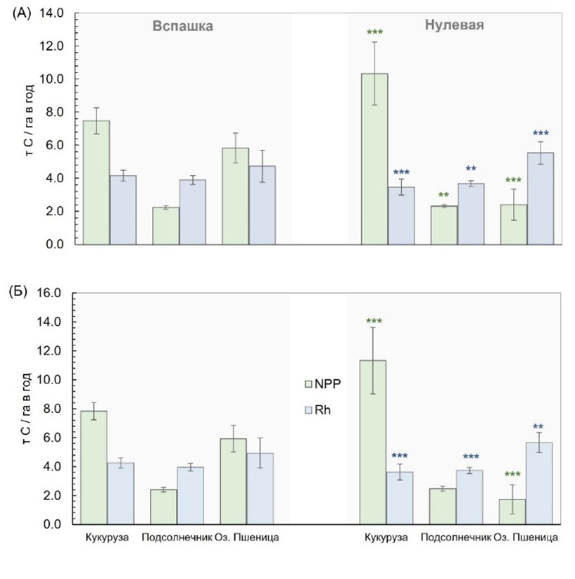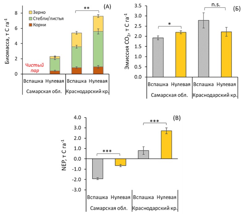 Анализ баланса С в течение вегетационного периода показал, что при использовании нулевой обработки NEP либо стремится к нулю (Самарская область), либо указывает на увеличение стока С в 3,4 раза (Краснодарский край) по сравнению с традиционной обработкой (рис. 1В).