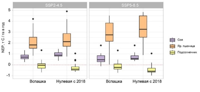 3. Fig. 2. Distribution of predicted C balance values ​​(NEP) for conventional and no-till agrochernozems under different agricultural crops in the Samara region for 2023–2100, taking into account the SSP2-4.5 and SSP5-8.5 climate change scenarios