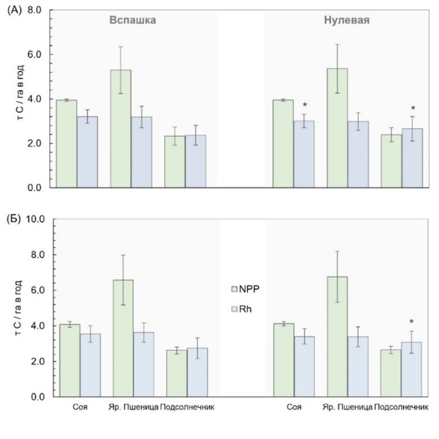 Рис. 3 Среднее значение ± стандартное отклонение составляющих баланса углерода: чистая первичная продукция (NPP) и микробное дыхание (Rh) при использовании традиционной и нулевой обработок агрочерноземов под разными сельскохозяйственными культурами в Самарской области за 2023-2100 гг. с учетом SSP2-4.5 (А) и SSP5-8.5 (Б) сценариев изменения климата (n = 25, 26, 27 для сои, яровой пшеницы и подсолнечника соответственно; *p ≤0.05, t-критерий Уэлча, сравнение между традиционной и нулевой обработками для каждой культуры и показателя отдельно)