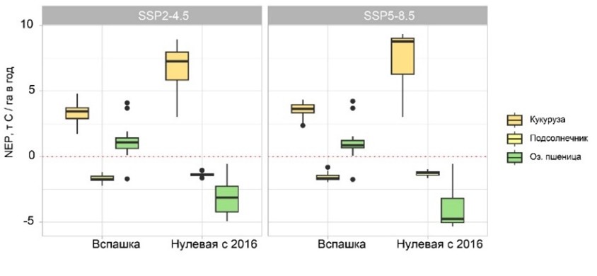 Рис. 2. Распределение прогнозных значений баланса С (NEP) при использовании традиционной и нулевой обработок агрочерноземов под разными сельскохозяйственными культурами в Самарской области за 2023-2100 гг. с учетом SSP2-4.5 и SSP5-8.5 сценариев изменения климата