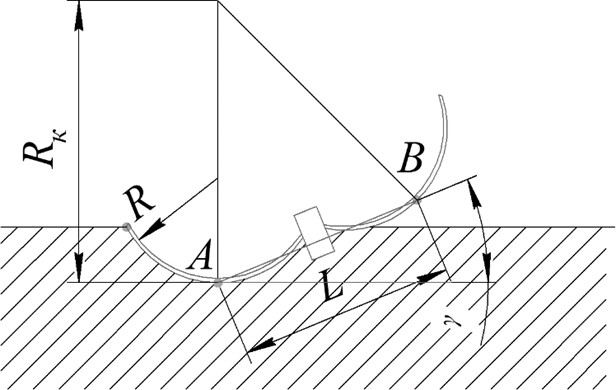 Для определения расстояния Rk, на которое удалены центры желобов относительно центральной оси катка (радиуса катка) рассмотрим случай, когда в почву внедряется только один жёлоб и глубина его погружения равна высоте желоба hк. На рисунке 4 представлена схема к определению расстояние между желобами.