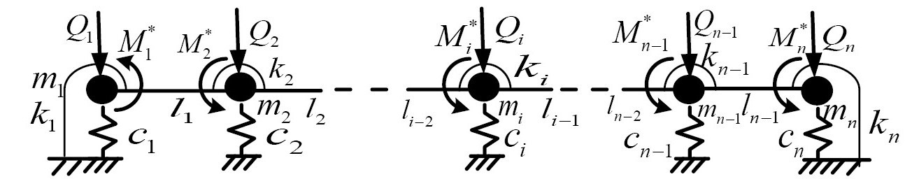 где L — протяженность конструкции, li, mi, ki, ci, Qi, — протяженность, масса, изгибная жесткость, жесткость основания, внешние сила и изгибающий момент для i-го элемента, соответственно. Очевидно, что при увеличении числа элементов дискретная модель неограниченно стремиться к исходной конструкции. При этом граничные условия и наличие промежуточных опор должны быть учтены коррекцией значений жесткости соответствующих линейных и спиральных пружин (например, жесткая опора может моделироваться пружиной, жесткость которой превышает остальные на 5–7 порядков).