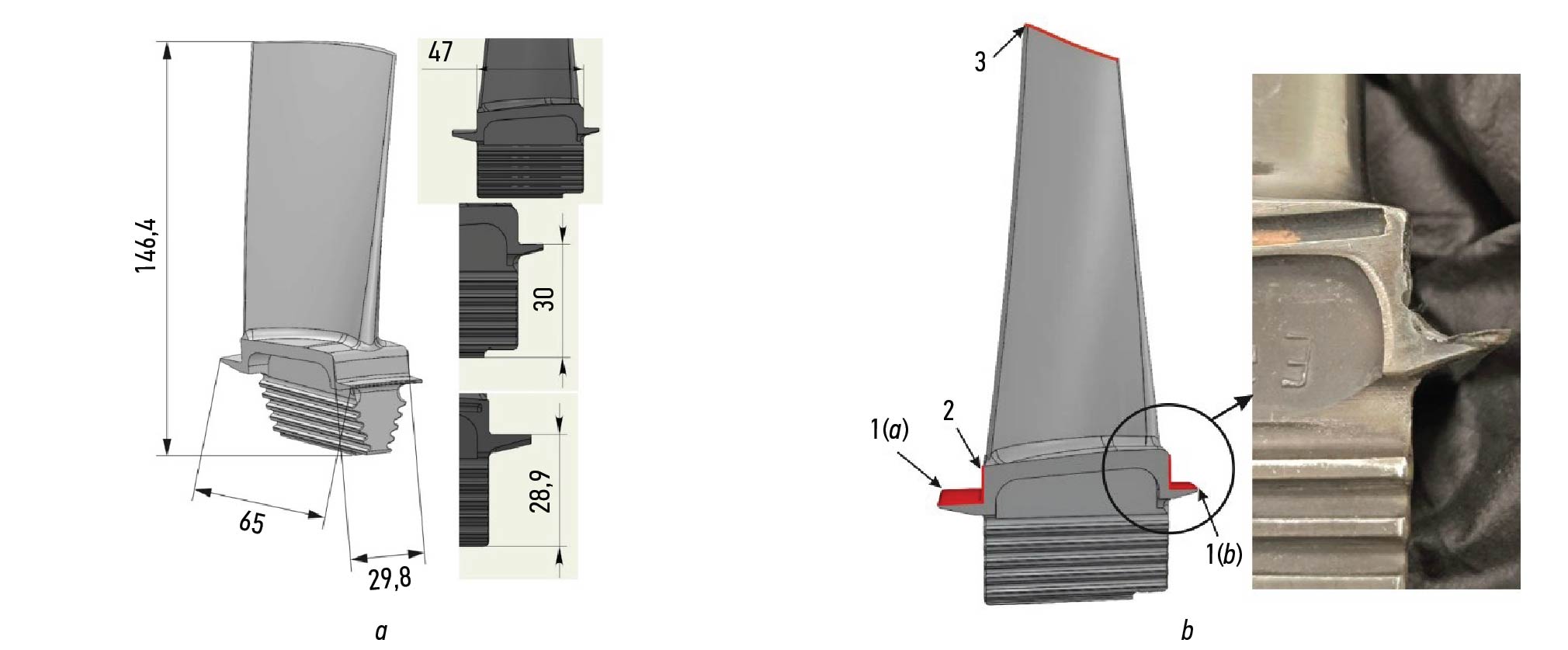 Рис. 1. Внешний вид рабочей лопатки ДР-59Л: a — размеры рабочей лопатки; b — изношенные поверхности рабочей лопатки.