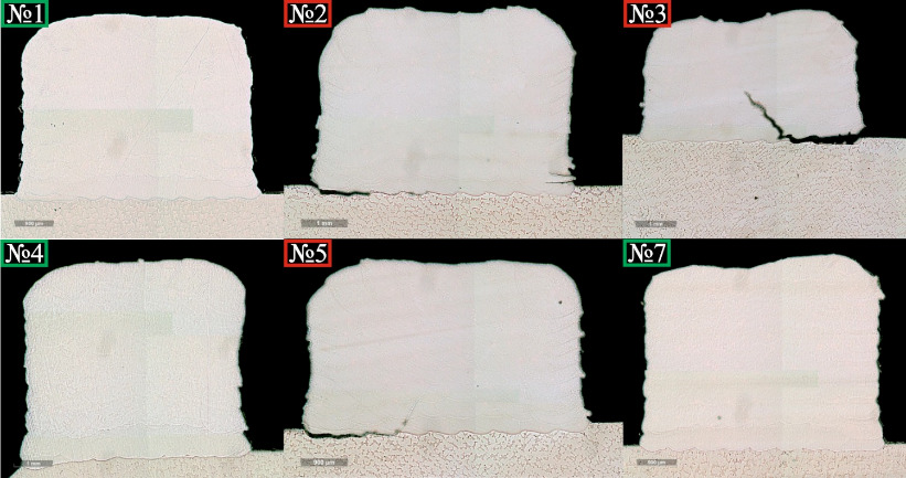 Как видно из рис. 5, образцы на режимах обработки № 1, № 4 и № 7 не имеют такие дефекты как трещины и несплавления, также все 3 режима наплавки показали устойчивость формирования слоев по высоте. Помимо этого, на режиме № 1 можно наблюдать небольшое скопление мелких пор в пределах допустимого.