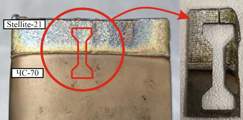 После этого на рабочем режиме наплавки была произведена наплавка пера на образце-свидетеле. Образец-свидетель подвергался неразрушающему контролю, металлографическому анализу, испытанию на растяжение и определению микротвердости.