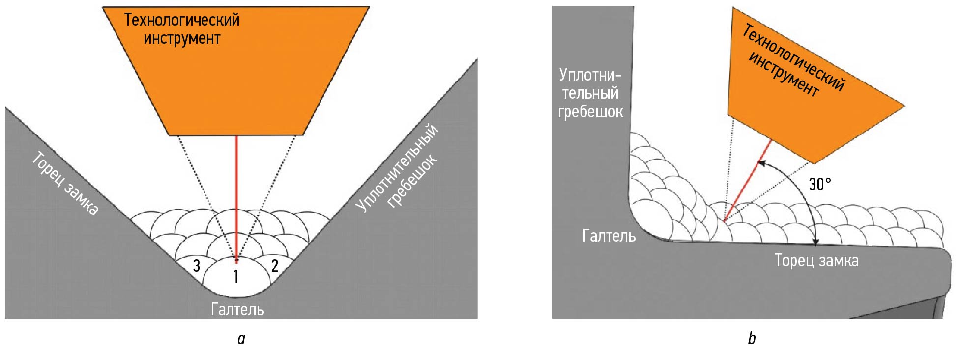 Для наплавки торцов замка и уплотнительных гребешков рабочей лопатки, необходимо сперва произвести наплавку галтели, как указано на рис. 8, a, где цифрами обозначен порядок наплавки валиков, т.е. сперва формируется центральный валик, а затем соседние валики, наплавка производится в 3 слоя. После наплавки галтели производится наплавка торцов замка и уплотнительных гребешков, как представлено на рис. 8, b.