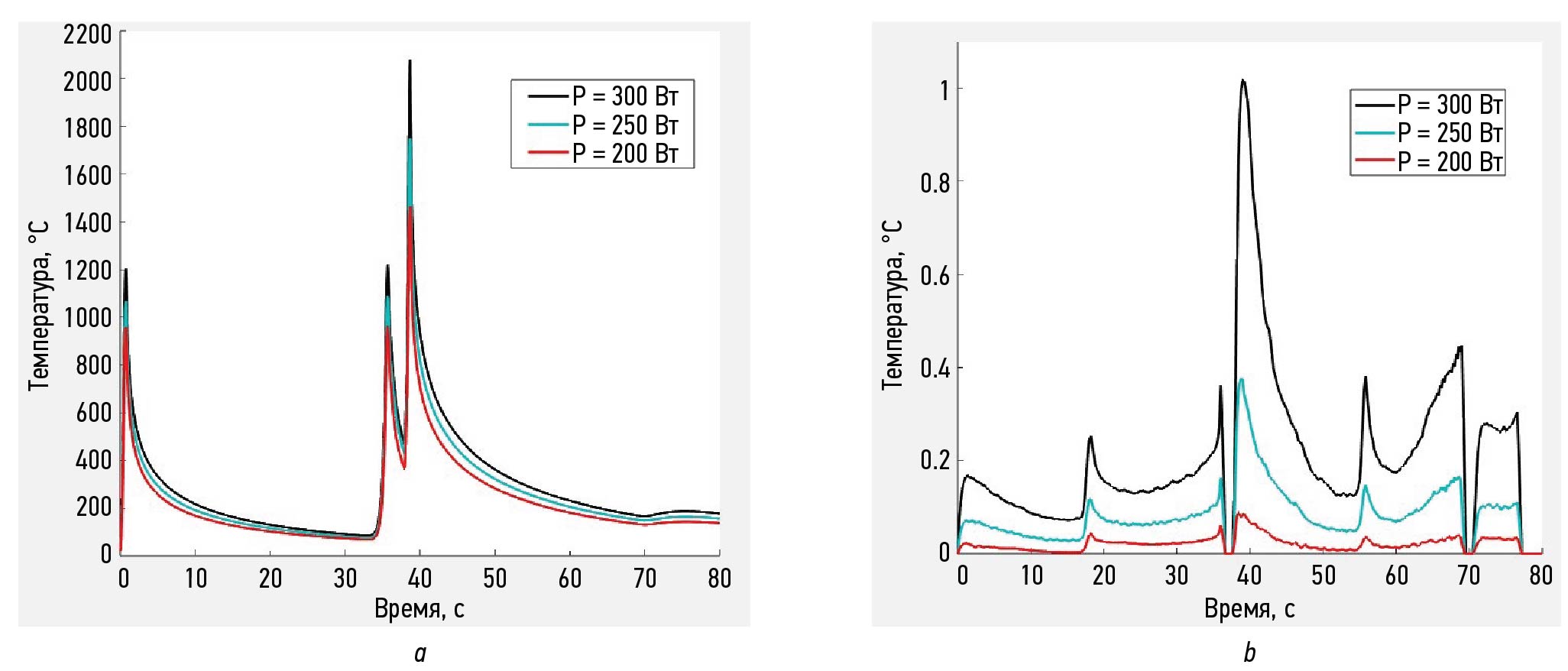 На рис. 10, a представлены термические циклы в точке А, которая отображена на рис. 9, в процессе наплавки при различных мощностях лазерного излучения. На рис. 10, b приведено сравнение размеров ванны расплава также при варьировании мощности.