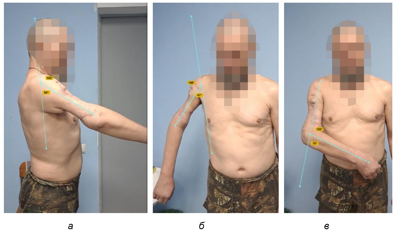 Уже при первом использовании экзоскелета удалось достигнуть сгибания в правом плечевом суставе до 90° (рис. 4а). Получено отведение правой верхней конечности – около 95° (с учетом движения лопатки) (рис. 4б). Сгибание правого предплечья – до 90° (рис. 4в). Значительно уменьшились боли при движении. Пациент, помимо занятий лечебной физкультурой в экзоскелете, получил возможность абилитационного эффекта, в частности пользоваться поврежденной рукой для выполнения бытовых функций – одевание, гигиеническтие процедуры и приема пищи.