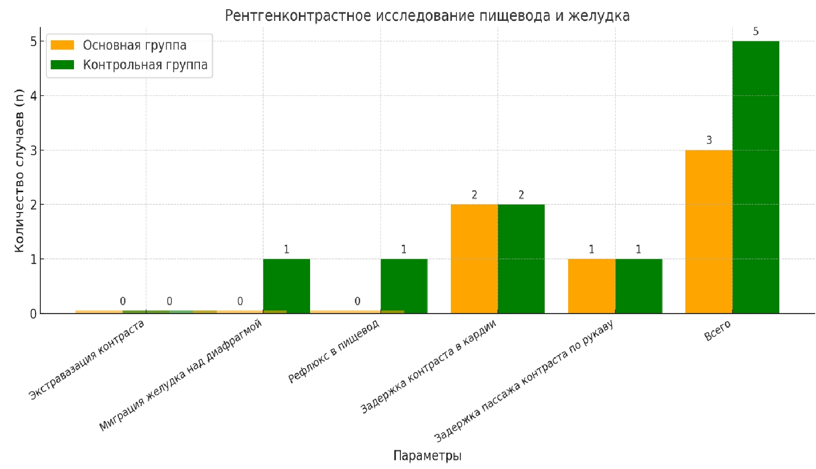 Осложнения. В основной группе интраоперационные осложнения наблюдались у 14 % пациентов (6 из 42), в контрольной группе – у 17,5 % (7 из 40). Наиболее частыми осложнениями были эмфизема средостения и повреждение серозной оболочки желудка. Все осложнения легкие и не требовали длительного лечения (рис. 2).