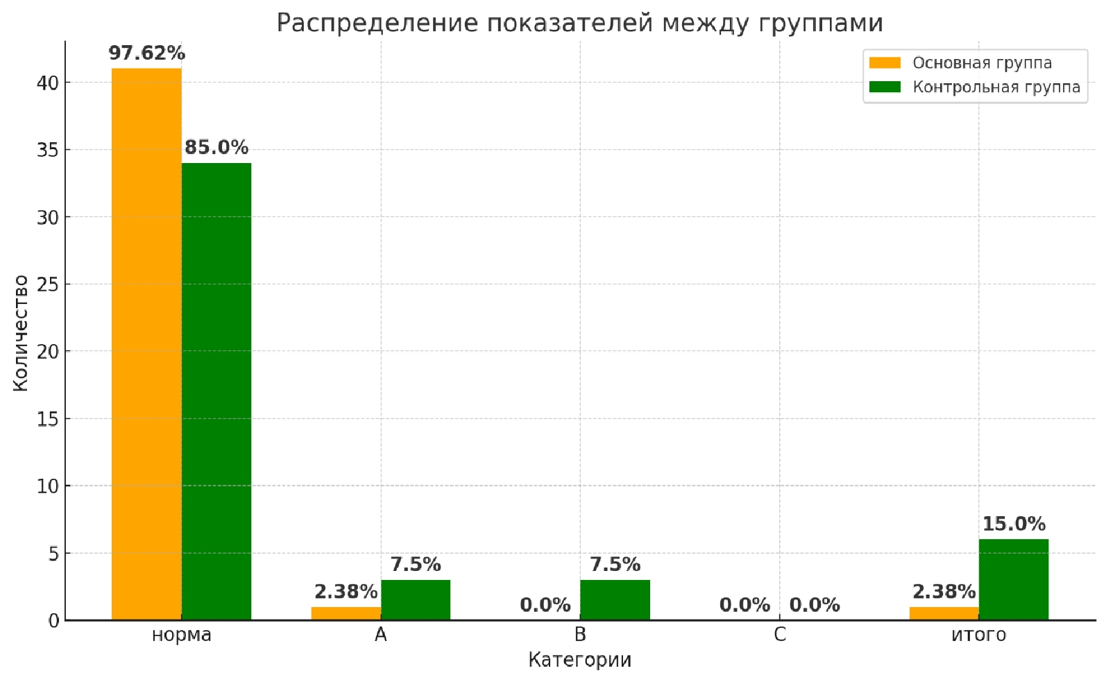 В контрольной группе у 85 % пациентов (34 из 40) отсутствовали признаки эзофагита. У 15 % пациентов (6 из 40) были выявлены признаки рефлюкс-эзофагита: у 7,5 % (3 из 40) – степень А, у 7,5 % (3 из 40) – степень В (рис. 6).
