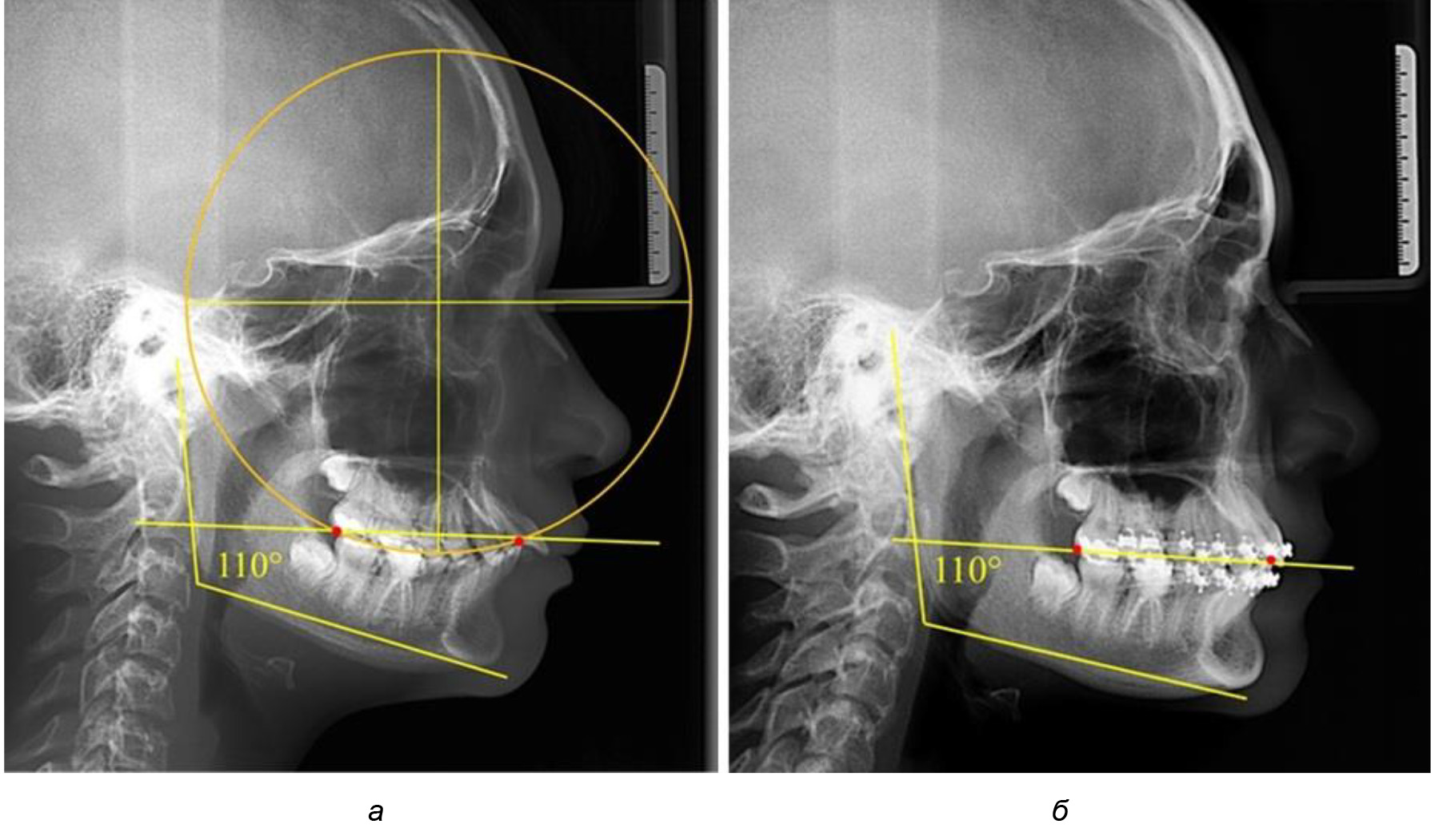 7. Рис. 6. Особенности ТРГ при оптимальной кривой Spee до лечения (а) и после лечения (б) техникой «прямой» дуги