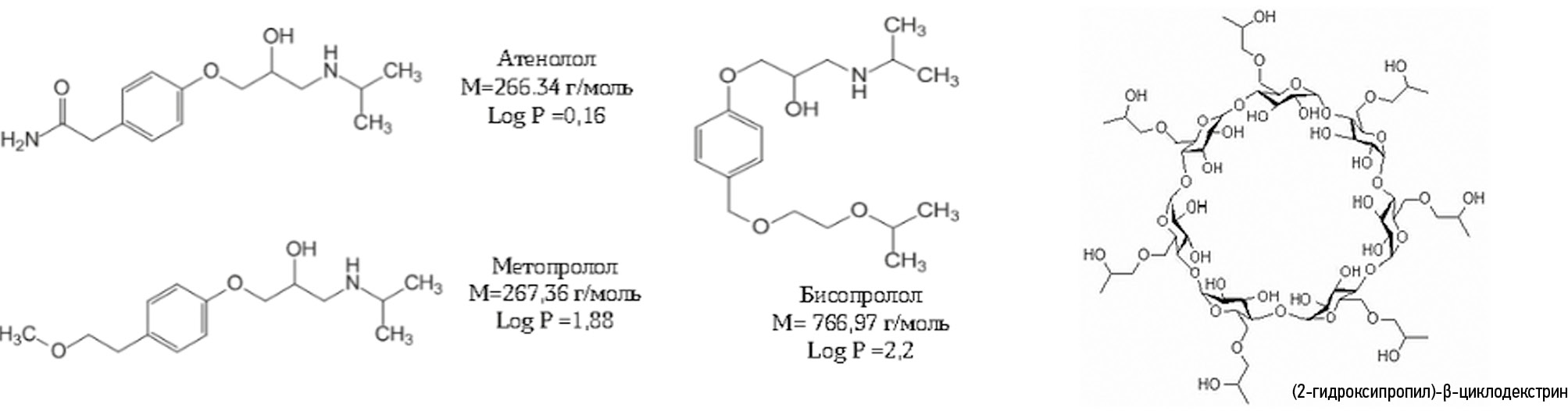 Объекты исследования. В качестве синтетических биологически активных соединений были выбраны лекарственные препараты, относящиеся к группе β-адреноблокаторов: бисопролол, атенолол, метопролол (рис. 1). В качестве макроциклического хозяина был выбран (2-гидроксипропил)-β-циклодекстрин (ГП-β-ЦД) (см. рис. 1).