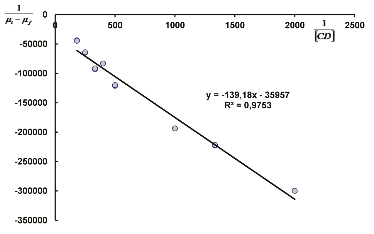 Рис. 3. Зависимость в координатах 1/(μi – μf) от 1/[CD] для определения константы связывания
