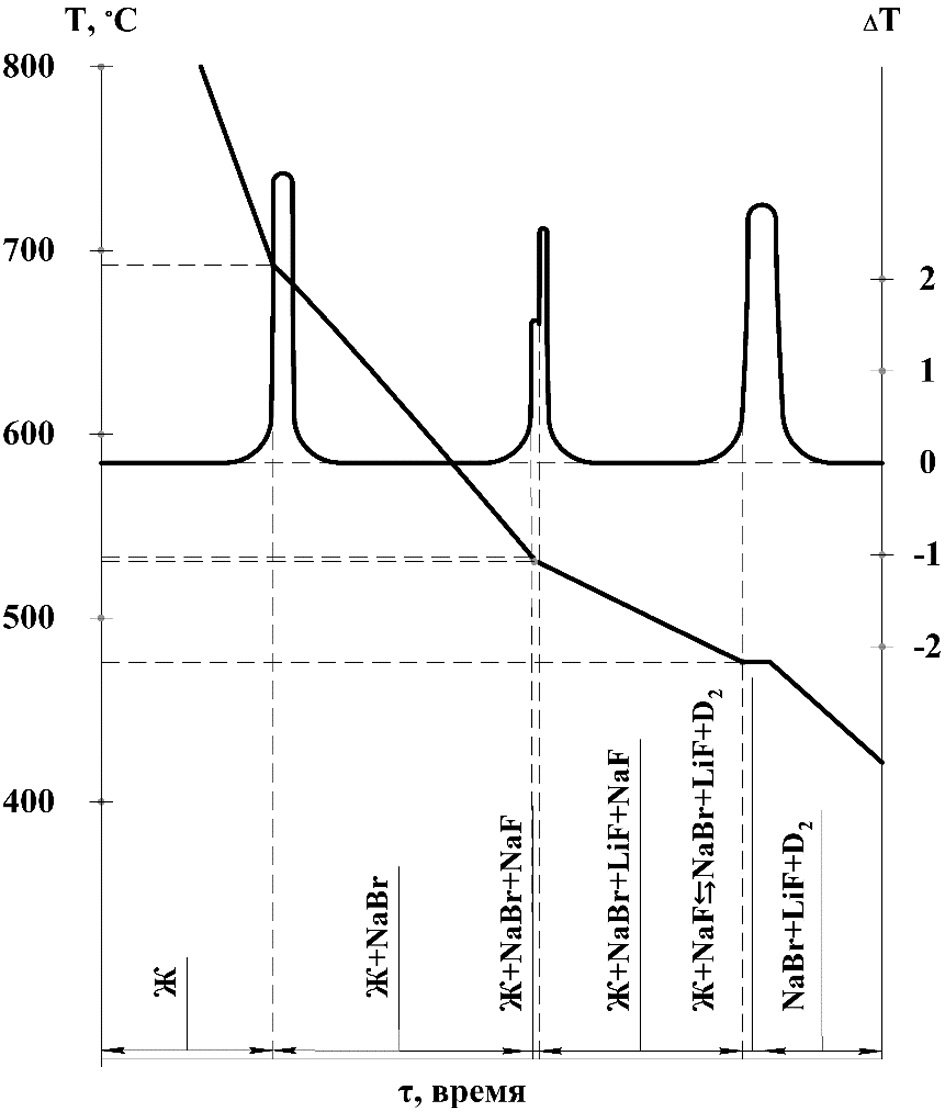 3. Рис. 2. Смоделированная термограмма охлаждения смеси «а» (5 %экв. LiF + 85 % экв. NaBr + 5 % экв. NaF + 5 % экв. Na2WO4)
