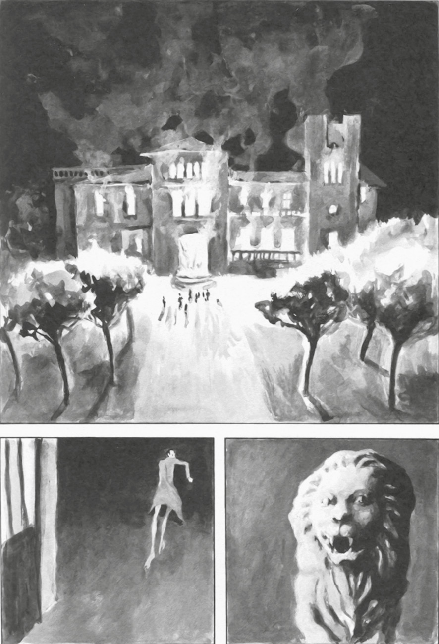 Приемы А. Толстого сохраняются в графической адаптации, в частности, сохраняется точка зрения. В одном из эпизодов рассказывается, как крестьяне, живущие на земле, недавно купленной Невзоровым, устроили бунт и пришли в его дом с оружием и факелами, так что Невзорову пришлось бежать. Он спрятался в кустах и окинул взглядом дом: «Он осмелел, разобрал кусты, выглянул: из-под крыши валил черный дым, в окнах плясало пламя. Он увидел также льва на кирпичном столбе, — старая морда его равнодушно глядела пустыми глазами на эту иллюминацию» [1, с. 123]. Вся эта фраза — взгляд Невзорова, то, что он видит из укрытия. В адаптации П. Рабате дана охватывающая горящий дом точка зрения, и, что самое главное, взгляд нарратора в конце падает на каменного льва. Лев изображен так, чтобы свет и тень демонстрировали, как его освещает пожар (рис. 1).