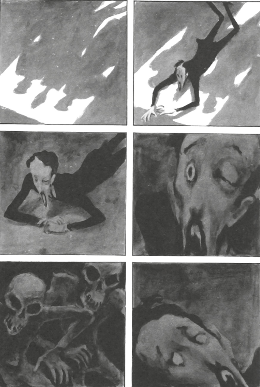 В графической адаптации сохраняется на визуальном уровне мотив преследующего Невзорова образа Ибикуса. Например, в эпизоде, где героя отправляют в тюрьму, показывается, как в лицах двух встреченных там заключенных он увидел образ Ибикуса: «Постепенно с левой стороны появилось какое-то бледное, овальное пятно. Скосившись направо, он различил второе пятно. Так и есть — темные глазницы и черты страшного оскала. “Вот он, проклятый, символ смерти, говорящий череп Ибикус...”» [1, с. 142]. На визуальном уровне у П. Рабате это проявляется в том, что заключенные изображены в виде Ибикусов (рис. 2).