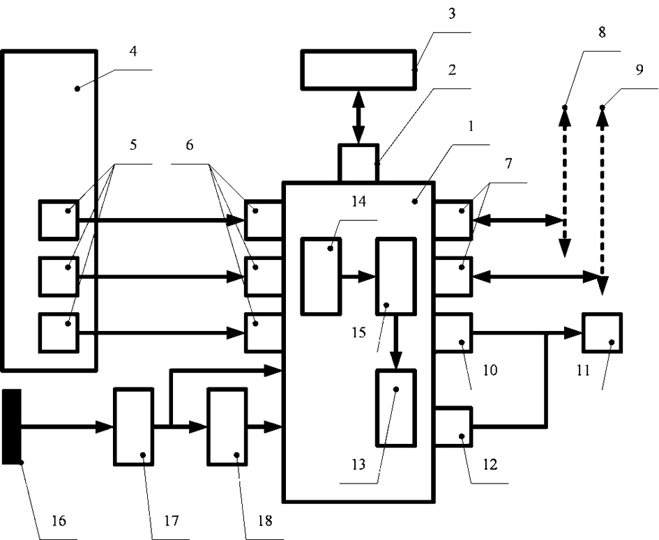 Результаты. В результате проделанной работы и анализа существующих разработок и решений в данном направлении (см. выше), была разработана структура нового универсального устройства мониторинга технического состояния (рис. 1) (заявка на изобретение № 2025103303 от 14.02.2025). На рис. 1 приняты следующие обозначения: 1 — контроллер, 2 — последовательный порт, 3 — сенсорный экран, 4 — электротехническое оборудование, 5 — цифровые датчики состояния оборудования, 6 — универсальные цифровые входы, 7 — дублированные порты Ethernet, 8 — шина станции, 9 — шина процесса, 10 — дискретные выходы на внешние устройства, 11 — внешние устройства, 12 — блок беспроводной связи, 13 — блок обработки данных, 14 — блок регистратора событий, 15 — встроенная память, 16 — сеть оперативного тока, 17 — блок питания, 18 — накопитель энергии.